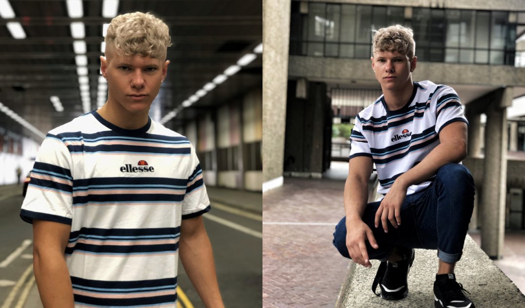 Der in Essex lebende Influencer Tommy stylt sich im Retro-Look von Ellesse. Er trägt das Acero Stripe T-Shirt, gepaart mit lässigem blauen Denim.