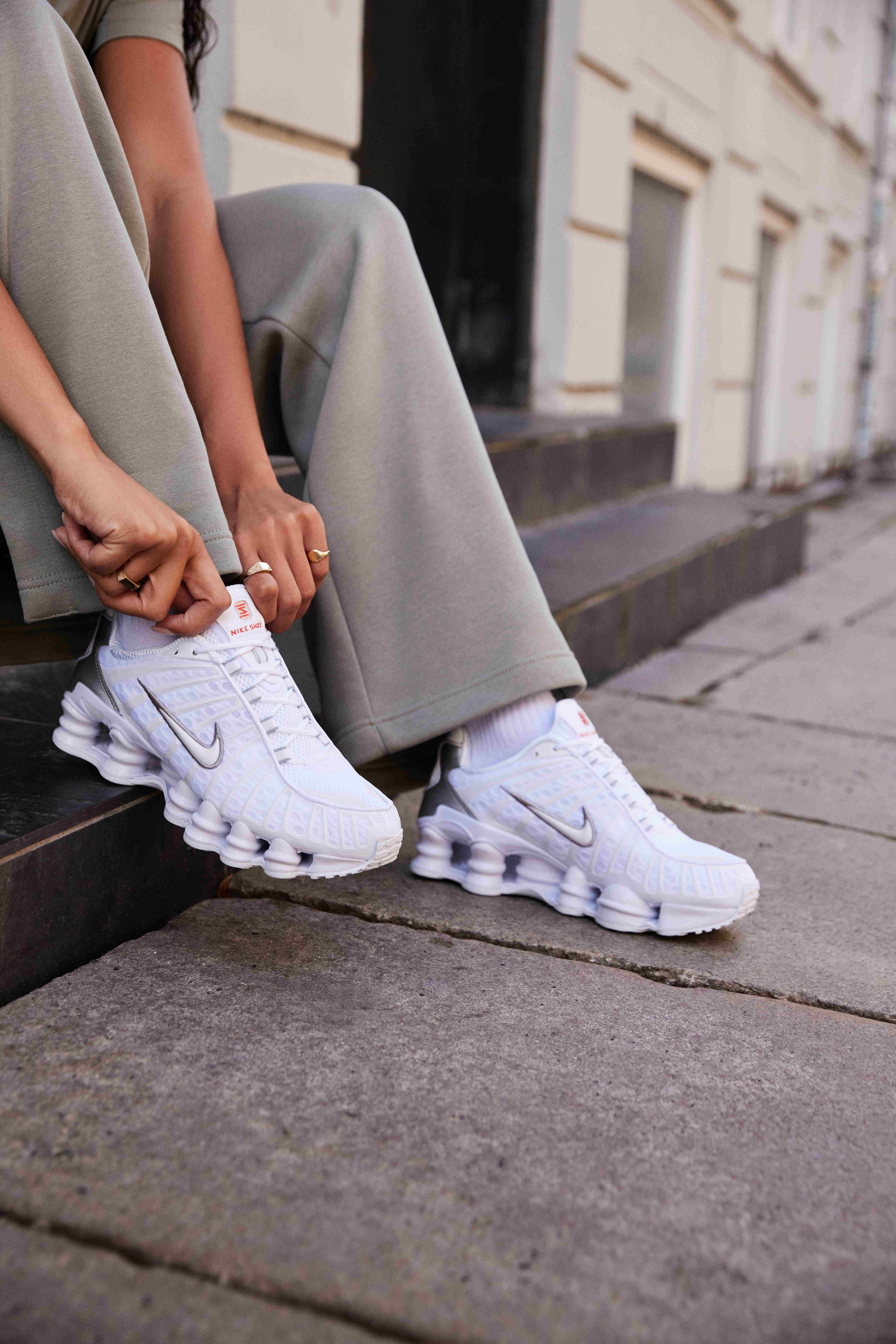 Sie hat keine Angst, mutig zu sein, schlüpft in ihre Nike Shox TL und kombiniert sie mit allem, was geht: Von Jogginghosen mit weitem Hosenbein bis hin zu Röcken und Trainingsjacken.